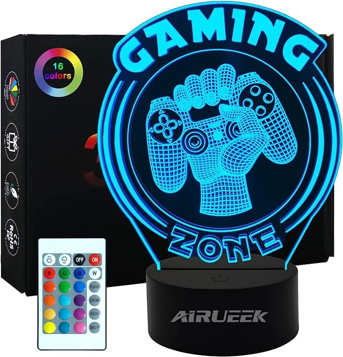 Die 3D LED Gaming Lampe mit Farbwechsel ist eine stilvolle und vielseitige Beleuchtungslösung, die sowohl als Gaming-Dekoration als auch als dekoratives Element für Schlafzimmer, Wohnzimmer und mehr verwendet werden kann. Mit ihrem beeindruckenden 3D-Effekt, der Auswahl von 16 Farben und der Fernbedienung für einfache Steuerung bietet sie eine unterhaltsame und anpassbare Beleuchtungsoption für jeden Raum.