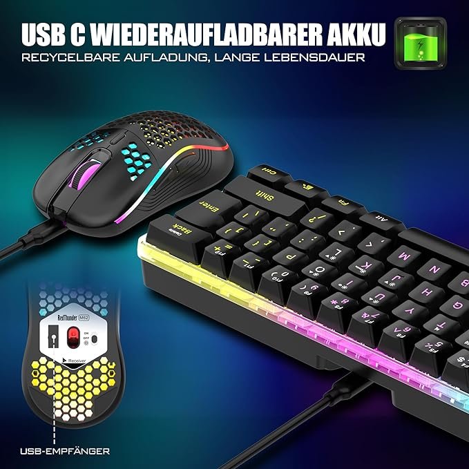 Ein 60% kabelloses Gaming-Tastatur und Maus-Set mit QWERTZ DE Layout ist eine kompakte und vielseitige Lösung für Gamer, die Wert auf Mobilität und ein aufgeräumtes Setup legen. Hier sind die Hauptmerkmale und Vorteile eines solchen Sets: