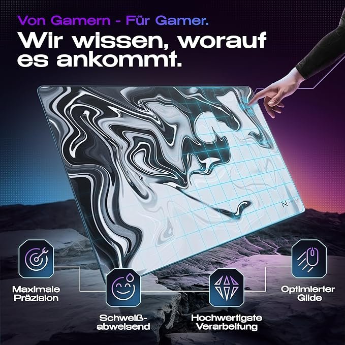 Zusammengefasst bietet das Nyfpad 900x500mm Gaming Mauspad im Liquid Design eine hochwertige, langlebige und ästhetisch ansprechende Lösung für eine Vielzahl von Anwendungen. Die Kombination aus großer Fläche, rutschfester Basis und optimierter Oberfläche macht es zu einer ausgezeichneten Wahl für sowohl Gaming als auch professionelle Arbeitsumgebungen.