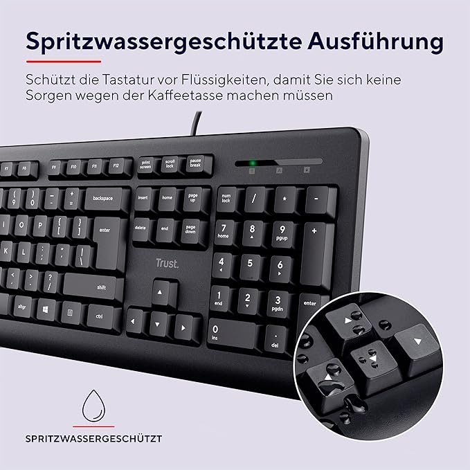 - Widerstandsfähigkeit: Die Tastatur ist spritzwassergeschützt, was bedeutet, dass versehentliches Verschütten von Flüssigkeiten (z.B. Wasser oder Kaffee) keine dauerhaften Schäden verursacht. Dies erhöht die Langlebigkeit der Tastatur.